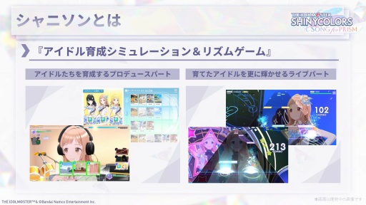同作はアイドルを育成するプロデュースパートと,育てたアイドルをさらに輝かせるライブパートに分かれ,後者ではリズムゲームをより高いスコアでクリアすることが目的となる。
