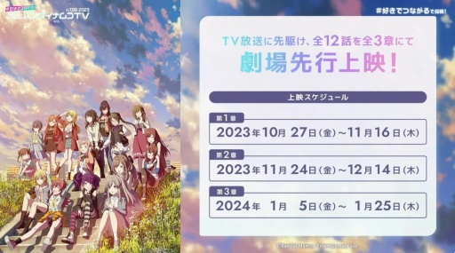 会場が大いに盛り上がったところで告知されたのが,TVアニメ「アイドルマスター シャイニーカラーズ」の情報だ。2024年の放送が予定されているが,劇場先行上映の第1章において初日舞台挨拶とライブビューイングの実施が発表された。