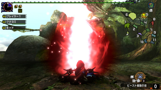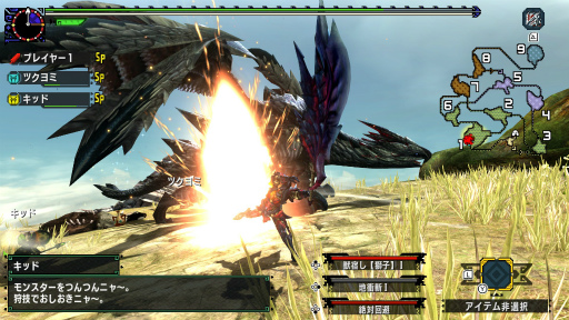 狩技の操作タイプは3種類用意されており,オプションで切り替えられる。今回,試したのは,狩技1が[↑]ボタン,狩技2が[→]ボタン,狩技3が[↓]ボタンというキーアサインのもの。そのため,移動しながら狩技を発動するには,左アナログスティックから指を離さないようにする必要があった。