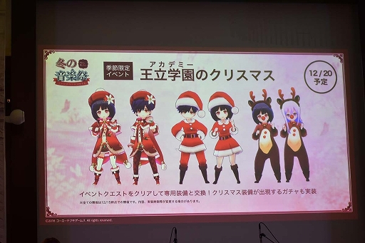 公開された新情報は,イベント限定装備が交換ラインナップとなったり,クリスマス装備が目玉のガチャが実装されたりする季節限定イベント「王立アカデミーのクリスマス」(12月20日〜),大型ボスと強敵が登場する新コンテンツ「降臨イベント」(12月27日〜),新たなイベントマップ&イベントダンジョンが登場する大規模な「年末年始イベント」(降臨イベントと同じく12月27日〜)などだ。