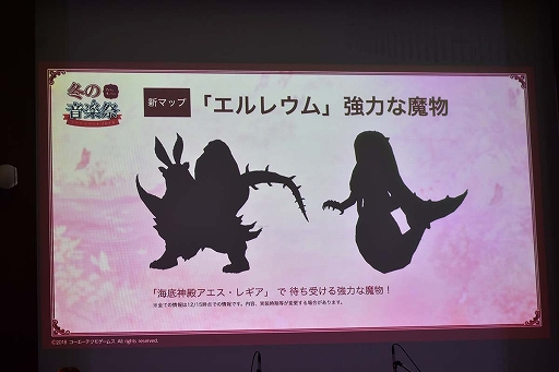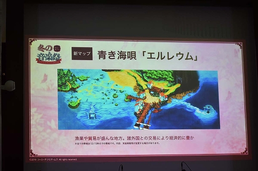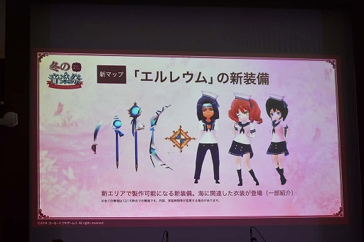 新マップについても明らかにされた。これまでなかった“海”を舞台とした青き海唄「エルレウム」は,産業や貿易が盛んで,諸外国との交易により経済的に豊かな地方とのこと。アカデミー錬金術科の講師を務める「ベルガモット」の出身地でもあり,シナリオにも関わってくるそうだ。また,「人魚岩」と「海底神殿アエス・レギア」という2つの新ダンジョンが探索でき,「海底神殿アエス・レギア」には強力な魔物が待ち受けている。セーラー服をコンセプトにした新装備もお披露目され,クリスマス装備に続き声優陣から「可愛い!」との声が上がった。