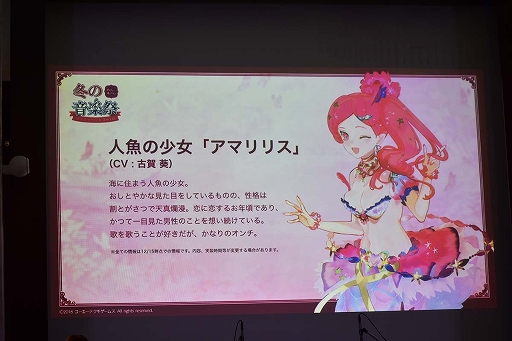 人魚の少女「アマリリス」(CV:古賀 葵)。海に住まう人魚の少女。おしとやかな見た目をしているものの,性格は割とがさつで天真爛漫。恋に恋するお年頃であり,かつて一目見た男性のことを想い続けている。歌うことが好きだが,かなりのオンチ
