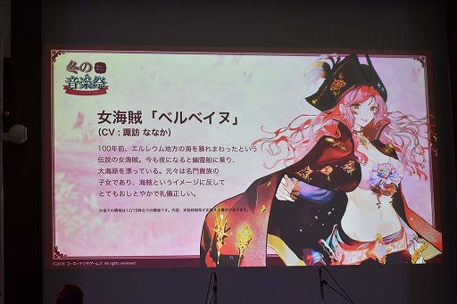 続いて公開されたのは,個性あふれる3人の新キャラクターの情報だ。1人めは,エピソードが面白おかしく描かれているのが特徴的という領主「ゴールデンロッド」(CV:山本兼平)。2人めは,新マップの「人魚岩」にまつわるエピソードが描かれる人魚の少女「アマリリス」(CV:古賀 葵)。そして3人めは,幽霊船に乗っている女海賊「ベルべイヌ」(CV:諏訪ななか)。