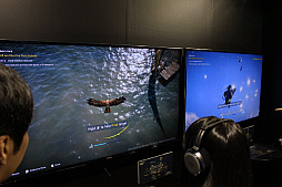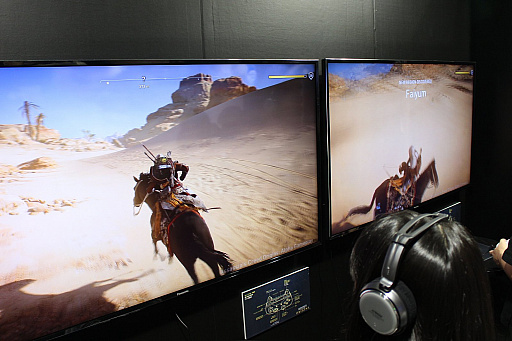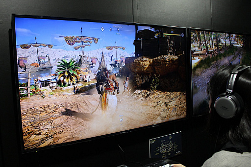 4K映像でゲームを体験できる仕様だ。これまでも美しいグラフィックスを誇っていたシリーズであり,その最新作の4K映像となれば,画面を見るだけでも大きな価値がある。実際にそれを目の当たりにすると,単純に美しいというだけでなく,砂漠の砂や水の濁りなど,表現的な部分にも目を奪われてしまうはず。試遊台ではストーリーに沿ったクエストもプレイできるが,単純に4Kで表現された世界を歩き回ってみるだけでも楽しめるだろう。