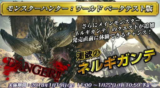 「MONSTER HUNTER: WORLD」第3回ベータテストが1月19日11:00から22日まで実施。今回は“ネルギガンテ”も狩猟できる!