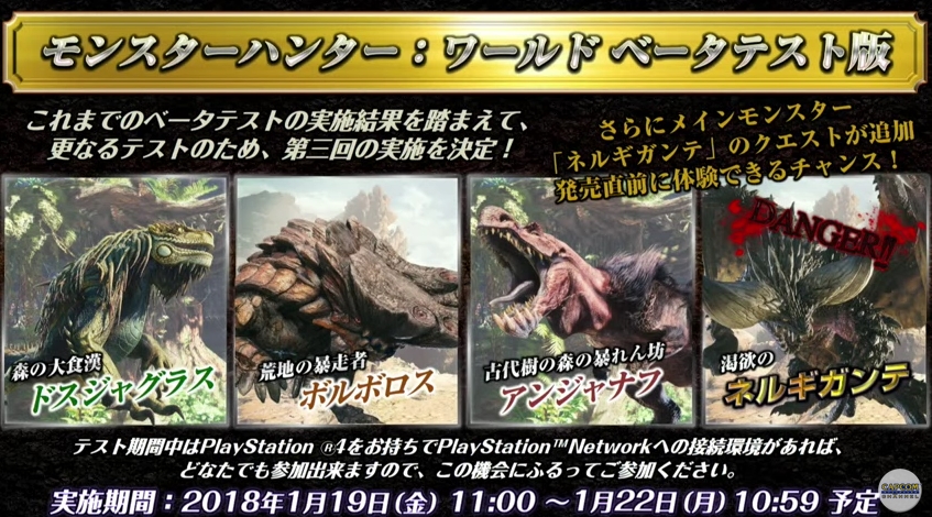 「MONSTER HUNTER: WORLD」第3回ベータテストが1月19日11:00から22日まで実施。今回は“ネルギガンテ”も狩猟できる!
