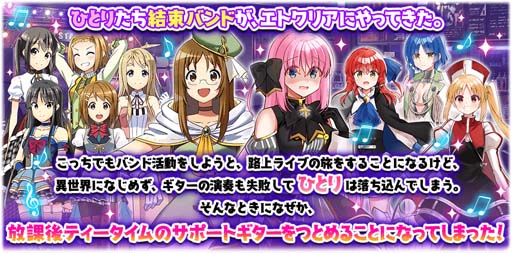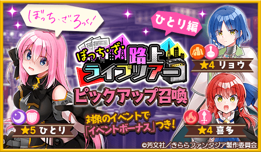 「ひとり編」では「ぼっち・ざ・ろっく!」より★5「後藤 ひとり(CV.青山吉能)」、★4「山田 リョウ(CV.水野朔)」、★4「喜多 郁代(CV.長谷川育美)」、「さわ子編」では「けいおん!」より★5「山中 さわ子(CV.真田アサミ)」の出現率がアップします。また、2編とも1回召喚する毎にボーナスPtが1ptずつ貯まり、250pt貯まると今回のピックアップ対象★5キャラクターを仲間にすることができます。
