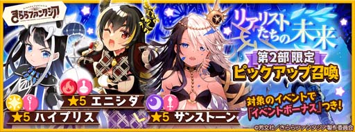 「きららファンタジア」のキャラクターが登場する「リアリストたちの未来第2部限定ピックアップ召喚」を開催します。本召喚では★5「ハイプリス【第2部】(CV.能登麻美子)」、★5「サンストーン【第2部】(CV.大橋彩香)」、★5「エニシダ【第2部】(CV.山田麻莉奈)」の出現率がアップします。また、1回召喚する毎にボーナスPtが1ptずつ貯まり、250pt貯まると今回のピックアップ対象★5キャラクターを仲間にすることができます。