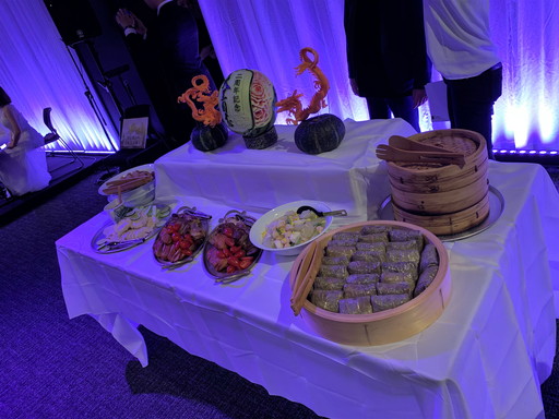 来場者たちにバイキング形式で提供された本格中華料理の品々。テーブル上部には,精巧なフルーツカービングが施されたスイカも鎮座していた