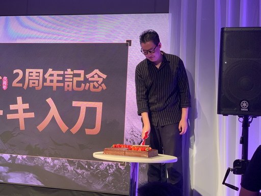 セレモニーの最後を飾ったのは,劉氏による2周年記念ケーキの入刀式。こちらも切り分けられ,バイキングのメニューに並ぶこととなった