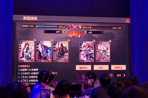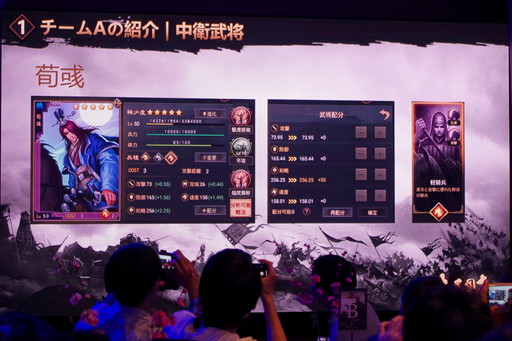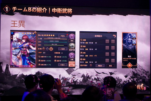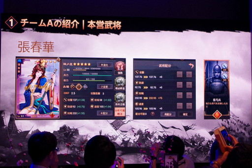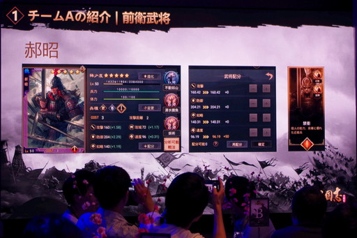 しばしの歓談タイムを挟み,続いて行われたのは「大三国志」シミュレーションゲームのコーナー。こちらは運営チームが事前に用意した部隊同士による戦闘の勝敗を来場者が予想し,全2戦の勝敗を的中させたプレイヤーには豪華景品がプレゼントされるというクイズ形式の催しだ。ただし,今回用意された部隊はどれも総戦力が同数となっており,単純比較では勝敗が導き出せないものとなっている。