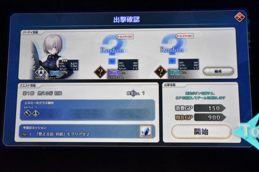 ![]() 出撃前の確認画面。今回はマシュ1人で出撃したので,残りの2騎はランダムで選ばれる。ここで敵の編成も確認できるので,自軍の編成を変更しておこう |