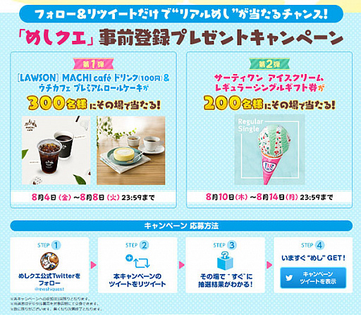 『めしクエ』の事前登録では期間に応じて様々なプレゼントをご用意!参加方法は簡単!上記期間中、『めしクエ』公式Twitterのフォローと、「♯めしクエで今すぐ飯ゲット」のついた対象ツイートをリツイートするだけで、総勢500名様に“リアルめし”が当たるチャンス!その場で抽選結果がわかるので、対象店舗でスマホ画面を見せて賞品と交換しよう!
