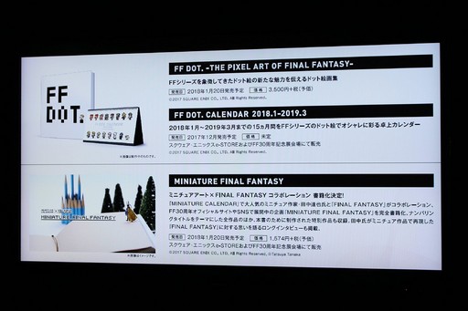 30周年記念の関連グッズは今後も続々と発売される。「FF DOT. -THE PIXEL OF FINAL FANTASY-」は,FF初期シリーズの懐かしいドット絵を1冊の書籍にまとめたもので,ドット絵を大きなピクセルで表示したものや,巨大すぎて画面では部分的にしか見られなかったボスを1枚の大きな絵にまとめたものなど,見ているだけで楽しい内容となっている。こちらは2018年1月20日発売。また同じコンセプトで製作されたカレンダー「FF DOT. CALENDAR 2018.1-2019.3」も,2017年12月25日に発売。