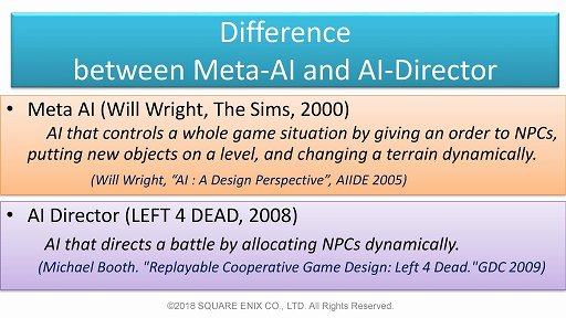 AIにある程度詳しい人だと,「メタAI」という言葉を聞くと「Left 4 Dead」で採用されたAIディレクターのことを思い出すかもしれない。だが「Left 4 Dead」のディレクターAIは,敵を動的に配置することで戦闘の激しさや難しさ,プレイヤーが感じる驚きなどをコントロールしようというものであって,その機能は限定的だ。