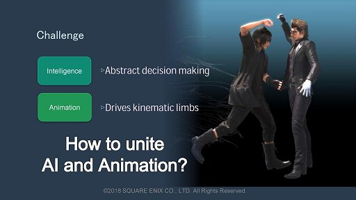 ここにおいて,この2つを統合するとなると,「AI技術にもアニメーション技術にも熟達した技術者」が必要になる。しかもFFXV級のタイトルともなれば,1人や2人ではまるで人数が足りない。言うまでもなく,これはあまりに非現実的だ。