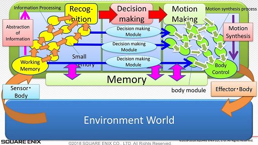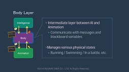 三宅氏はまず,「知性と身体には深い関係がある」と指摘する。本作においてはこの問題について,「AIによる判断と,キャラクターのアニメーション(=キャラクターが実際に行う動作)がつながっていく」ポイントが着目された。