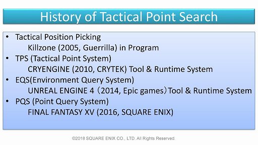 ポイントクエリ・システムが司っているのは,主に戦闘における行動の最適化である。これは古くは「KILLZONE」が実装し,あるいはCRYENGINEやUnreal Engine 4も似たような効果が得られるシステムを有しているもので,「どこに移動して敵を攻撃すれば有利か」を自律的に判断して行動するシステムとなっている。