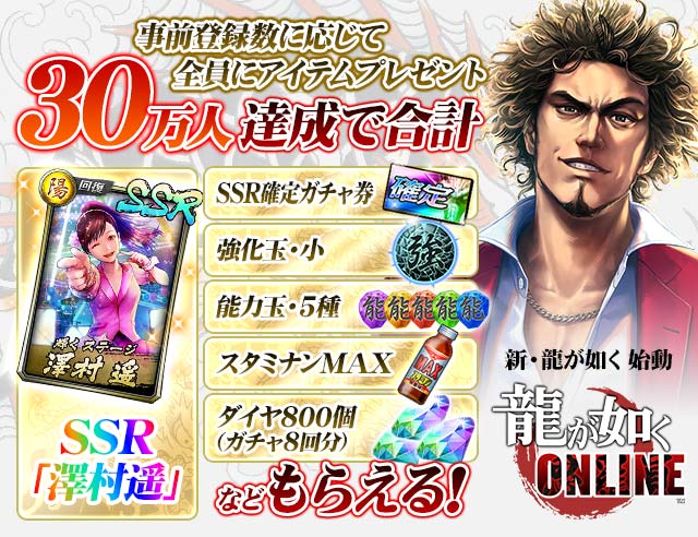 「龍が如く ONLINE」,事前登録者数が20万人を突破。30万人達成でもらえる追加特典も公開