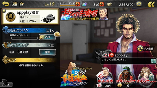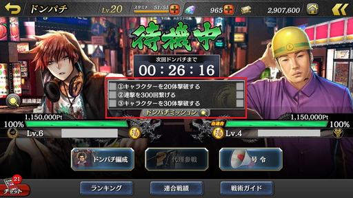 「ドンパチ」は,メインストーリー第2章の第6話をクリアすると開放される,連合に加入することで参戦できる。開放時点では自分だけが所属する連合になっているため,そこから強力な連合を目指してもいいし,ほかの連合に加入してもOKだ。