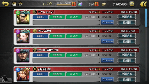 ほかの連合に加入する場合は,加入申請を出して承認してもらう必要がある。とはいえ,承認なしで加入できるようになっている連合もたくさんあるので,気負わずに人数の多い連合に申請してみるといいだろう。連合によっては「初心者OK」などのアイコンも表示されているので,連合探しの目安にしよう。