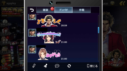 しかし,実際に連合に参加してみると,そんな疑問や不安が杞憂であったことに気づかされた。むしろ初心者なのに参加しただけでありがたがられた。そもそも「ドンパチ」では,そこまでコミュニケーションを取る必要がないため,気楽にできるというのが大きい。例えば,連合参加時に開放されるチャット欄では,ゲーム内に用意されている「スタンプ」で,一通りの会話が成立してしまうので,文字で会話している人はほとんどいないのだ。