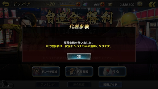 ちなみに,アプリを起動しなくてもドンパチに参加してオートで戦ってくれる「代理参戦」も用意されているので,忙しい人も安心してほしい。1日に1回のみという使用制限こそあるものの,設定しておけばドンパチに参加できないタイミングでも自動的に参加して戦ってくれる。