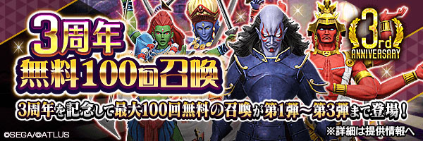 「D2メガテン」で3周年 真・感謝祭が開催中。“3周年無料100回召喚”の第1弾や特別★5セレクターを獲得できるログインボーナスを実施