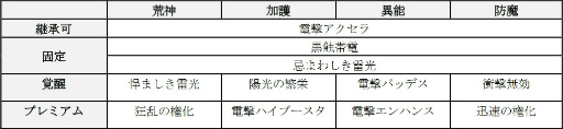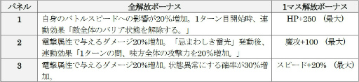 電撃貫通・魔封無効を得る。魔封状態の敵に対して与えるダメージが30%増加する。自身が生存中、敵全体は電撃属性で受けるダメージが40%増加する。「忌まわしき雷光」「悍ましき雷光」発動時と自身以外の味方が電撃属性のスキルを発動時、連動効果が発動「1ターンの間、敵全体の攻撃力・防御力・回避と命中を20%減少させ、基礎確率50%で魔封状態にする。攻撃成功時、敵単体に電撃属性の魔法型ダメージを威力60で与える。