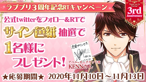 3周年記念キャンペーンでは、昨年11月に実施した「ラブプリ総選挙2019」にて上位5位までに入賞したアベル、ユアン、レヴィン、ギルバート、ディアスが現代服で日本を旅する“もしも”の設定を楽しめる特別ストーリーを配信。普段は王宮で暮らす彼らの現代服姿を公開するのは今回が初めて。また、本作登場キャラクター11名の声を務める豪華声優陣のサイン色紙が当たるTwitterキャンペーンの開催や、本編のスピンオフとしても楽しめるスチル&ストーリープレゼント、ログインボーナス、3周年記念イラストの公開なども。日頃の感謝を込めた、特別なキャンペーンをお届けします。