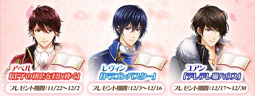 昨年11月に実施した「ラブプリ総選挙2019」のTOP3にランクインしたアベル、レヴィン、ユアンのショートストーリーとスチルを11月21日(土)より順次プレゼントします。幼い頃の主人公(あなた)とアベルの甘酸っぱい出会いを描いたお話しや、さらわれたあなたを助けに来る勇敢なレヴィンの姿、猫好きなユアンに思わずこちらがデレてしまいそうになるストーリーをお届けします。配信は期間限定となりますので、お見逃しなく。