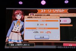 リズムゲームパートを終えると,アイドルの中から1人を選びコミュを発生させられる。コミュを経ることでも親密度が上がっていく仕組みのようだが,イベントを発生させても親密度が低いと塩対応をされる可能性もあるようだ。公開されたムービーでは,靴箱の前で結城秋葉に声をかけるも,「またね」とかわされてしまう様子を確認できた。アイドルと仲良くなるには日々の積み重ねが重要ということだろうか。
