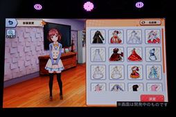 「ステージ衣装」をそれぞれ着せ替えられ,上下セットの衣装と2つのアクセサリーを設定できるようだ。キャラクターそれぞれに好きな衣装を着てもらえるので,3Dのキャラクターがステージ上で歌って踊るリズムゲームパートは,非常に賑やかな印象だった。