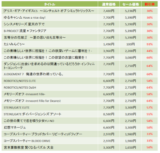 対象タイトルはADV「STEINS;GATE ELITE」や,「STEINS;GATE ダイバージェンシズ アソート」ホラーゲーム「コープスパーティー ブラッドカバー リピーティッドフィアー」「コープスパーティー BLOOD DRIVE」リズムゲーム「たいみんぐぅ〜 」などがラインナップされている。