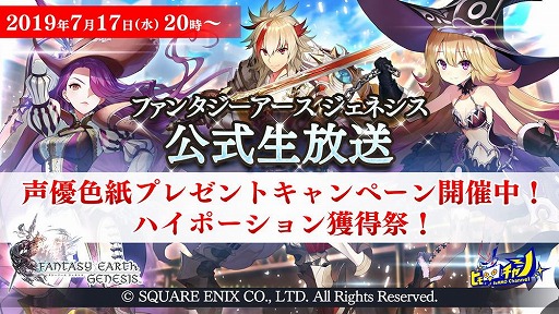 また、7 月 17 日(水)20 時からは、アソビモ公式生放送番組「ビモチャン」にて『ファンタジーアースジェネシス』の放送を実施。河野智幸(FEG プロデューサー)と内山スグル(FEG監修ディレクター/スクウェア・エニックス)が、ユーザーの皆様と一緒に白熱の戦争を繰り広げます。本放送は、YouTube Live、ニコニコ生放送、Periscope の 3 メディアで配信します。