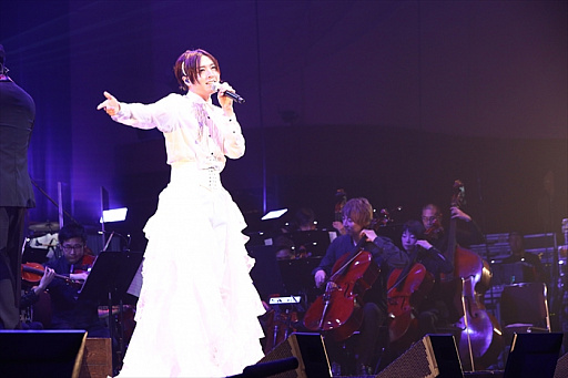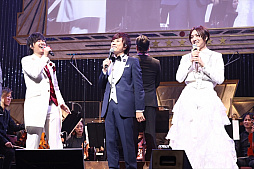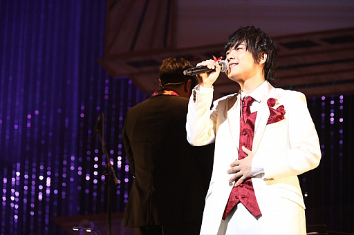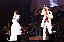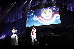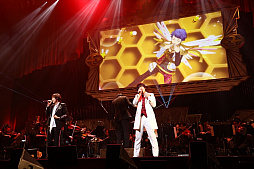オーケストラLIVEパートの1曲目はTVシリーズの第10話で登場した「MOONSHINE」を蒼井翔太(如月ルヰ役)が歌唱。続く2曲目は如月ルヰのソロショーで使用された「I know Shangri-La」を披露。劇中さながら、切ない表情を浮かべながら歌う蒼井に、感動の拍手が響き渡りました。3曲目はTVシリーズ第11話で一条シン(CV.寺島惇太)のソロショーにシャインが登場した「プラトニックソード」。曲の半ばで、シャイン役を務めた斎賀みつきがサプライズ登場し、寺島惇太とデュエットを披露。寺島と斎賀の力強い歌唱に心を奪われた会場から、割れんばかりの拍手と歓声が起きました。4曲目の「Silent Promise」は本シリーズのゲームアプリに収録された如月ルヰのソロ楽曲。幸せな夢の中で愛する人を想う切ないラブバラードを寺島惇太とのデュエットで歌い上げました。