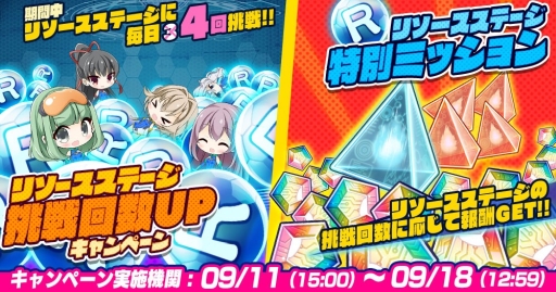 今回、装備機能のアップデートを記念して「第一回装備アップデートキャンペーン」を開催します! キャンペーン期間中はリソースステージの挑戦回数が1回増加するので、装備の強化に必要なリソースをたくさん獲得できるチャンスになっておりますので、毎日、リソースステージに挑戦してリソースを集めましょう!!