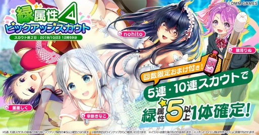 ★5以上のキャラクターが緑属性しか排出されない属性ピックアップスカウト「緑属性ピックアップスカウト」を開催します! ★5以上のキャラクターが1体確実に手に入り「AP回復薬フル」が1本おまけで付いてくる5連スカウトも回数限定で登場しますので、このチャンスをお見逃しなく!!