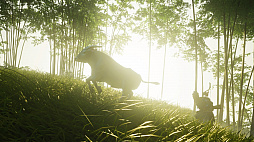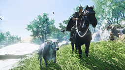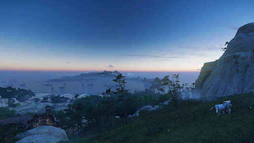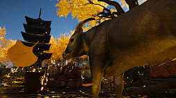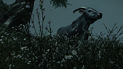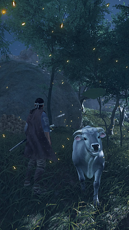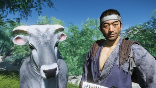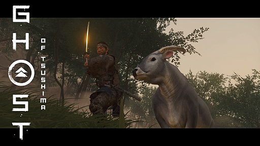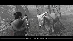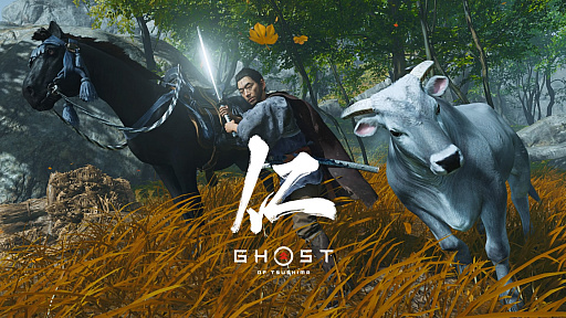 Ghost of Tsushima」。対馬を舞台に主人公の武士,境井 仁の活躍を描く本作に登場する牛は,RDR2とは正反対の癒やし系だ。