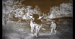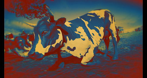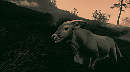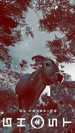 かつて突進されて痛い目に遭った八つ当たりのため,ヘレフォード種の雄牛に忍び寄る主人公アーサー。使うエフェクトで見え方もガラリと変わる