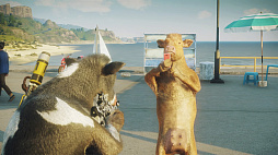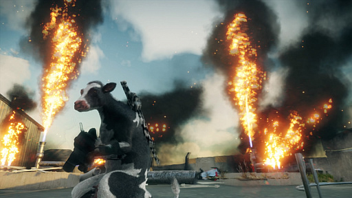 ド派手な破壊や爆発が醍醐味のひとつでもある本作。牛になってもやることは変わらない。着弾までに時間がかかる武器を使ったり,爆発物に突っ込む途中で車から飛び降りたりすれば,視線をカメラへ向ける余裕が生まれるはず