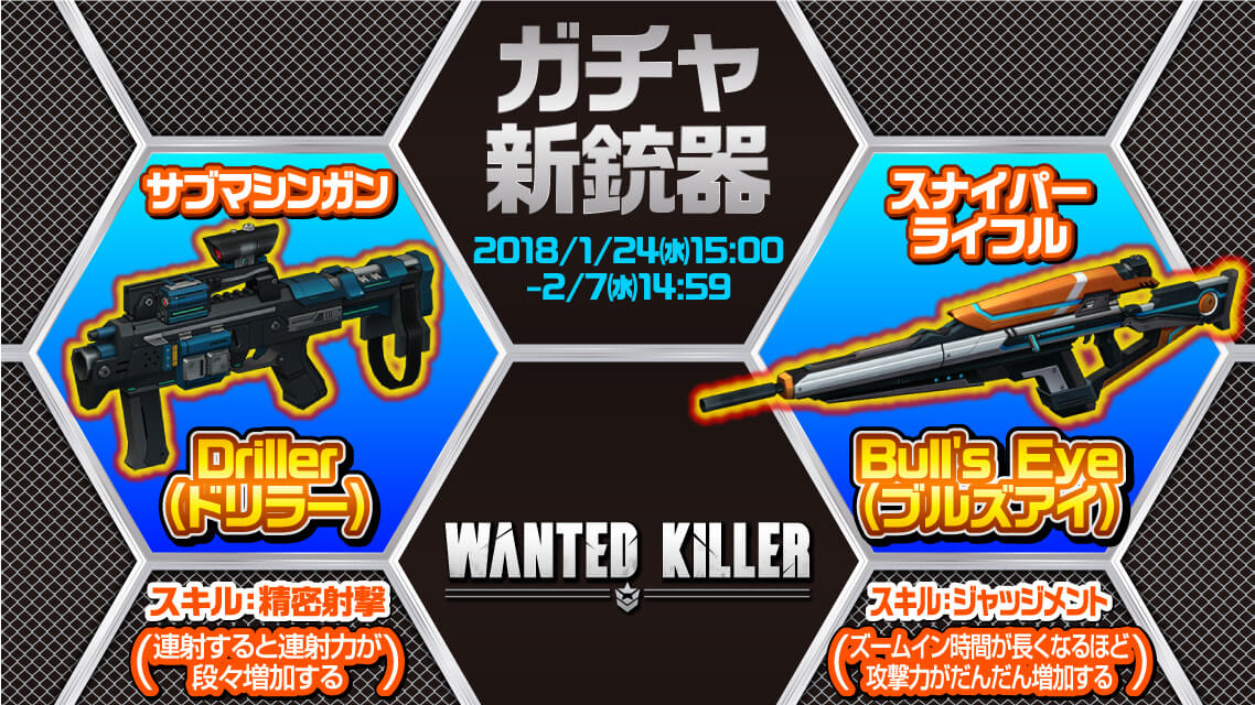「WANTED KILLER」,ガチャ限定の新銃器「Driller」と「Bull's Eye」が登場
