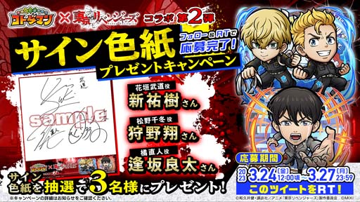 コトダマン公式Twitterアカウントをフォローし、対象のツイートをリツイートすると、新祐樹さん(花垣武道役)、林勇さん(佐野万次郎役)など、コラボ登場キャラクター声優の寄せ書きサイン色紙(全5種)が抽選で当たるTwitterキャンペーンを実施します。