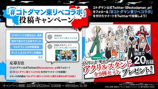 コトダマン公式Twitterをフォローし、「#コトダマン東リべコラボ」を付けてツイートを投稿した方の中から抽選で20名様に「TVアニメ『東京リベンジャーズ』アクリルスタンド全9種セット」をプレゼントします。