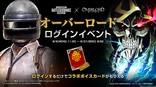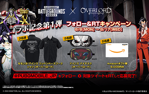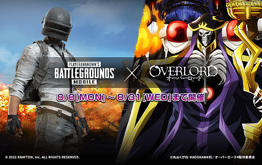 PUBG JAPAN株式会社(東京都渋谷区渋谷1-3-15 BIZCORE渋谷 8F 代表取締役 キム・チャンハン)は、『PUBG MOBILE』において、2022年8月8日(月)より『オーバーロード』とのコラボを開始することをお知らせいたします。