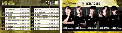 「PMJL SEASON2 Phase1」では、Day9終了段階で上位3チームが49ポイント差という僅差を争う接戦となりましたが、最終日Day10にて、「DONUTS USG」が3ドン勝・合計91ポイントを獲得し、Phase1の王者となりました。