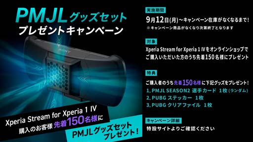 ソニー製ゲーミングギア Xperia Stream for Xperia1 Ⅳの購入者の先着150名様にPMJL SEASON2選手カード1枚(ランダム)、PUBGクリアファイル1枚、PUBGステッカー1枚を進呈いたします。