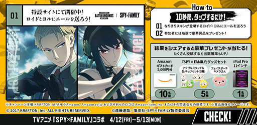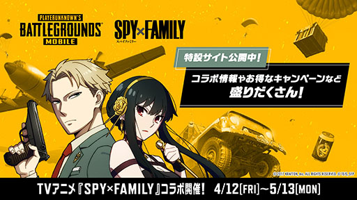 KRAFTON JAPAN株式会社(代表取締役 イ・カンソク)は、『PUBG MOBILE』において、大人気TVアニメシリーズ『SPY×FAMILY』とのコラボを4/12(金)より開始したことをお知らせいたします。