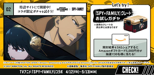 また,「SPY×FAMILYコラボ記念ログインボーナス」も開催中で,「SPY×FAMILYイベントクレート」や抽選でドン勝メダルが当たる引換券「極秘任務指令書1」を獲得できる。さらに,特設サイトのゲームに参加すると,Amazonギフトカードなどが当たるキャンペーンに応募可能だ。