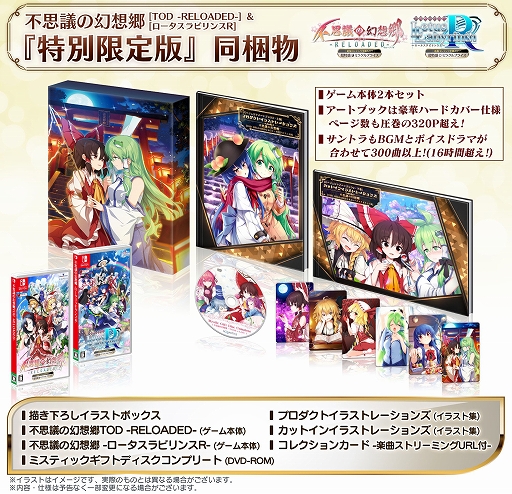 併せて、新価格版ソフト2本と、作品にまつわる数々のイラストや音源などの豪華特典を描き下ろし特製ボックスにぎゅっと詰め、「不思議の幻想郷」の世界を一気に満喫できる特別限定版をご用意いたしました。限定版特典内では、次回新作開発中のイラストやカットインそしてデモ楽曲も先行収録いたします。